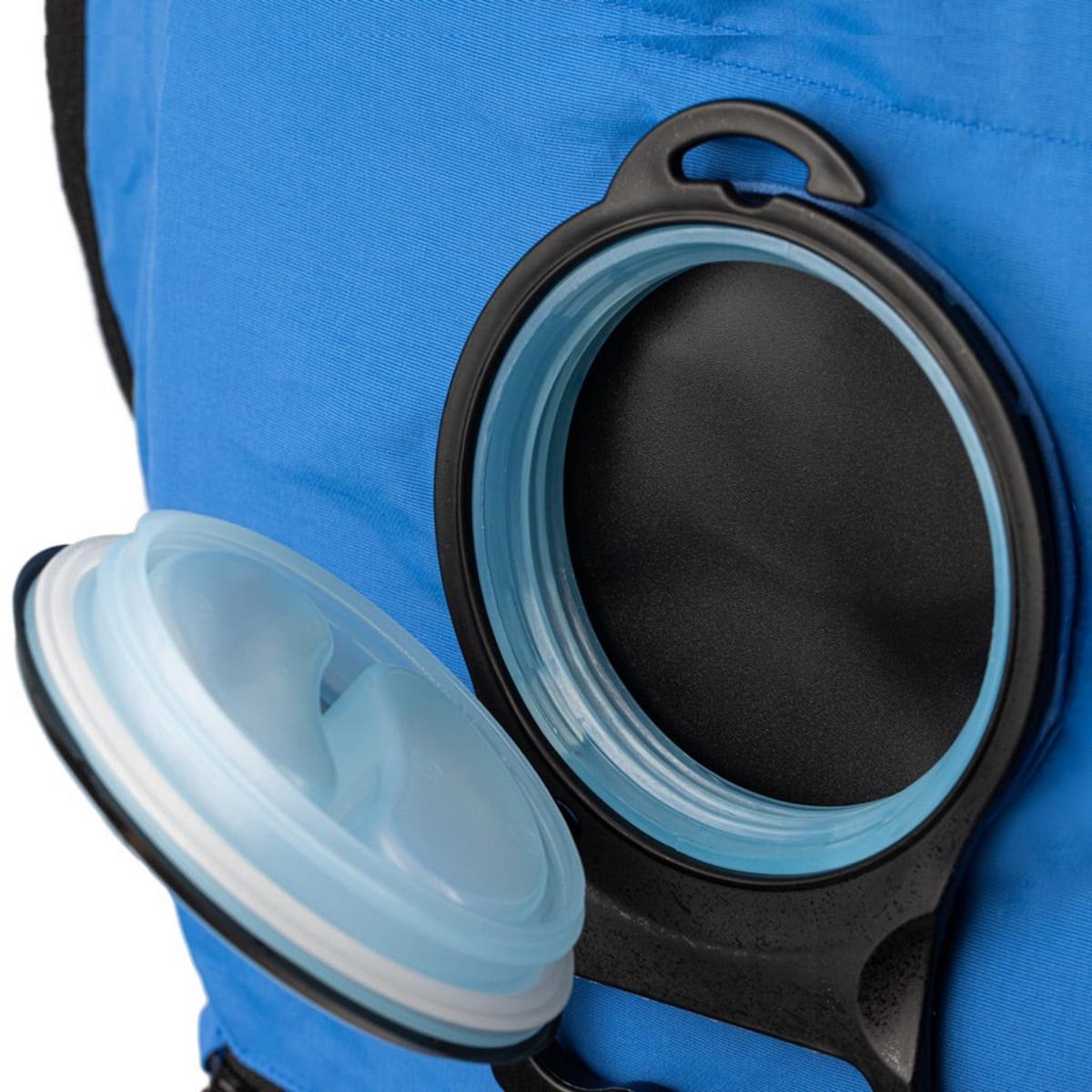 One Ice pack with a special anti-thawing, non-toxic gel is added to the vest reservoir which then gets filled with cool water. This creates a fully enclosed system that routes the water flow around the front and back of the vest along the lines (shown in blue on the product image, but not visible on the actual vest)