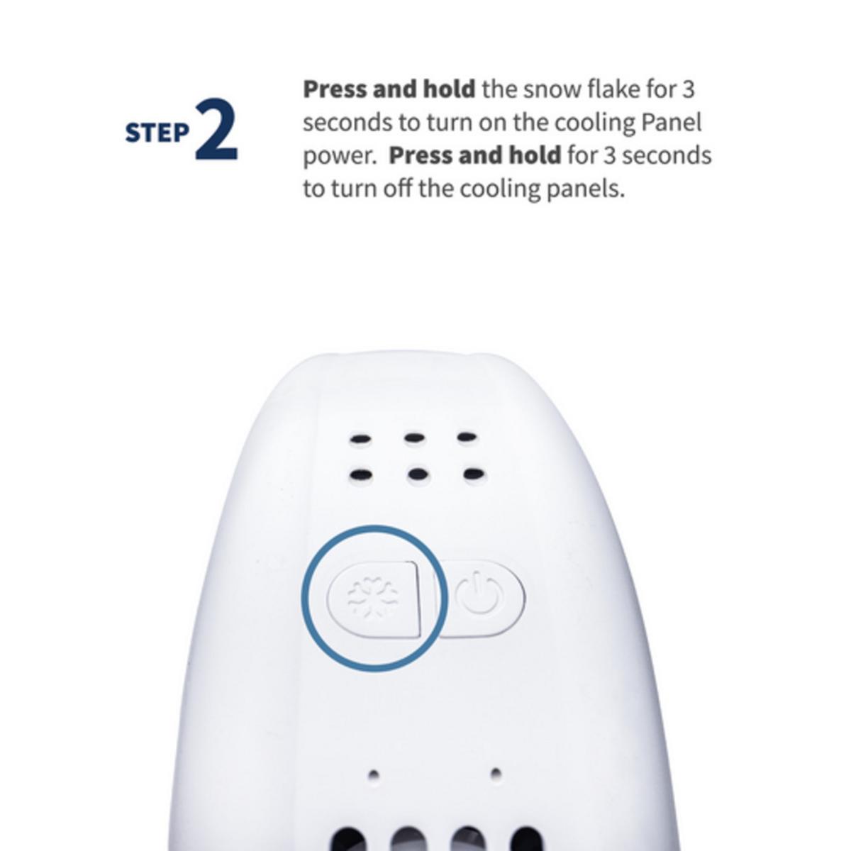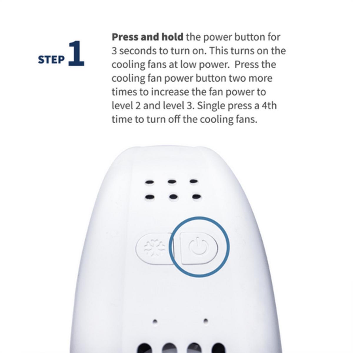2. Power On & Set Cooling: Short press the power button to choose your fan speed. Long press for 3 seconds to activate cooling mode.