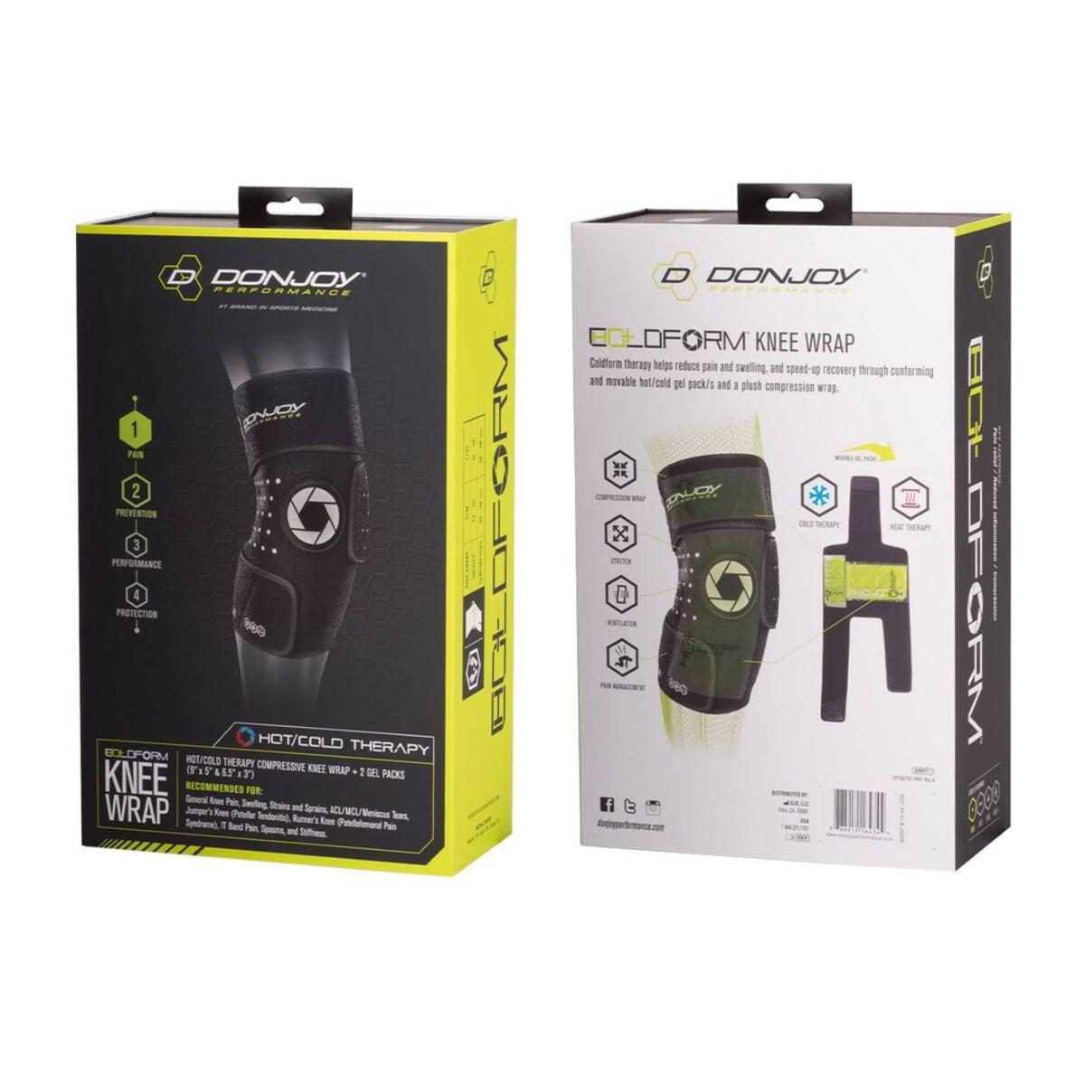 The DonJoy Performance Coldform Knee Wrap delivers cold and hot therapy to reduce pain and swelling; and to speed up recovery associated with knee injuries. With a low-profile and compression wrap design, this wrap allows for hands-free and comfortable therapy. The Coldform Knee Wrap comes with two gel packs (9"x5" & 6.5"x3").