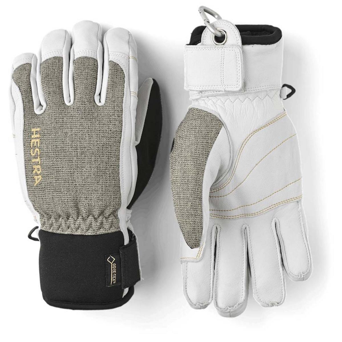 Hestra Army Leather GORE-TEX Short is a light, warm ski glove for skiers that appreciate finger dexterity and comfort. A goat leather palm features outseams for better grip and the backhand is made of stretchy softshell fabric. GORE-TEX makes it waterproof and breathable, and a thin, practical synthetic insulation helps keep in the heat. The fit closely follows the hand and the short collar fits well under many types of sleeves. A wrist strap reduces the chance of dropping the glove and the included carabiner enables you to secure the gloves to your jacket or backpack. to A versatile ski glove that lets you explore all types of mountain terrain, from piste to park to high alpine slopes.