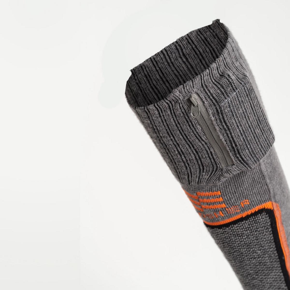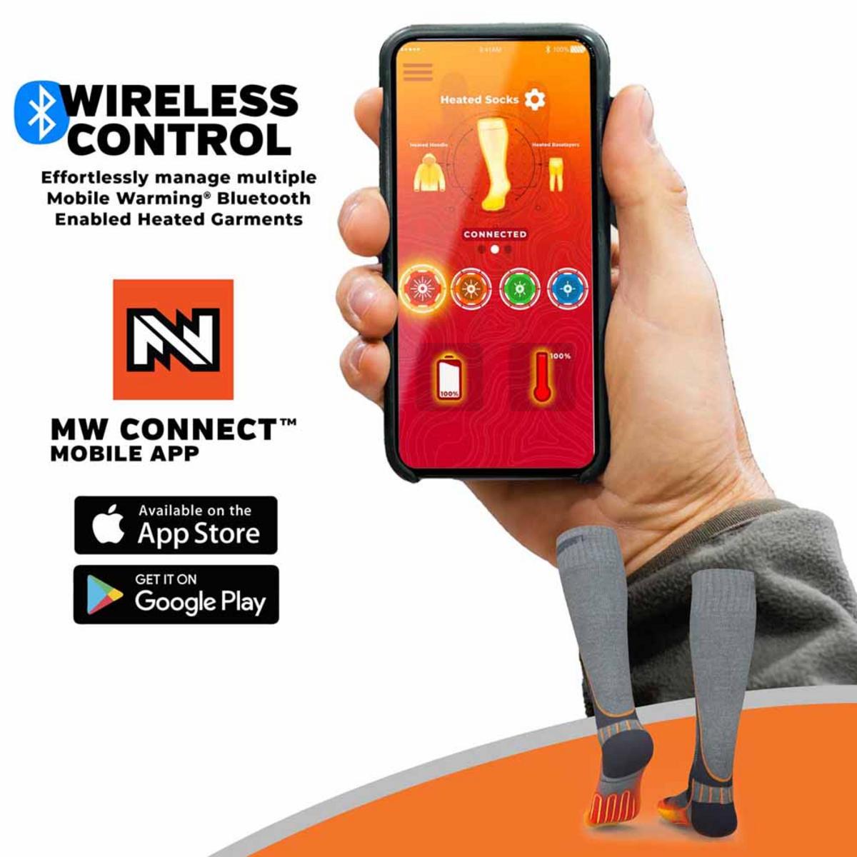 The Mobile Warming Merino 2.0 Heated Socks are a thoughtful blend of comfort and Mobile Warming's Mobile Warming technology. Powered by our Powersheer USB-C 3.7-Volt Lithium-ion battery that provides long-lasting warmth for up to 16 hours on a single charge. Take all-day comfort to the next level. Whether you're in deep back country powder or an early morning job site, keep your feet warm and improve circulation to avoid stiffness, muscle fatigue, and soreness. With heavy cushioning in key areas and heating elements under the front of the foot, you can avoid the discomfort and numbness that come with being outside in cold conditions. The Merino Wool fabric blend is breathable, and the full-calf length provides comprehensive coverage. Use our simple 4-button remote control to adjust your heat settings, ensuring you maintain complete comfort and control.