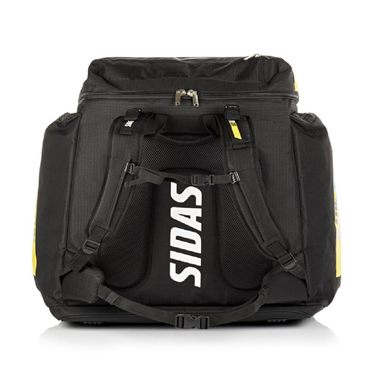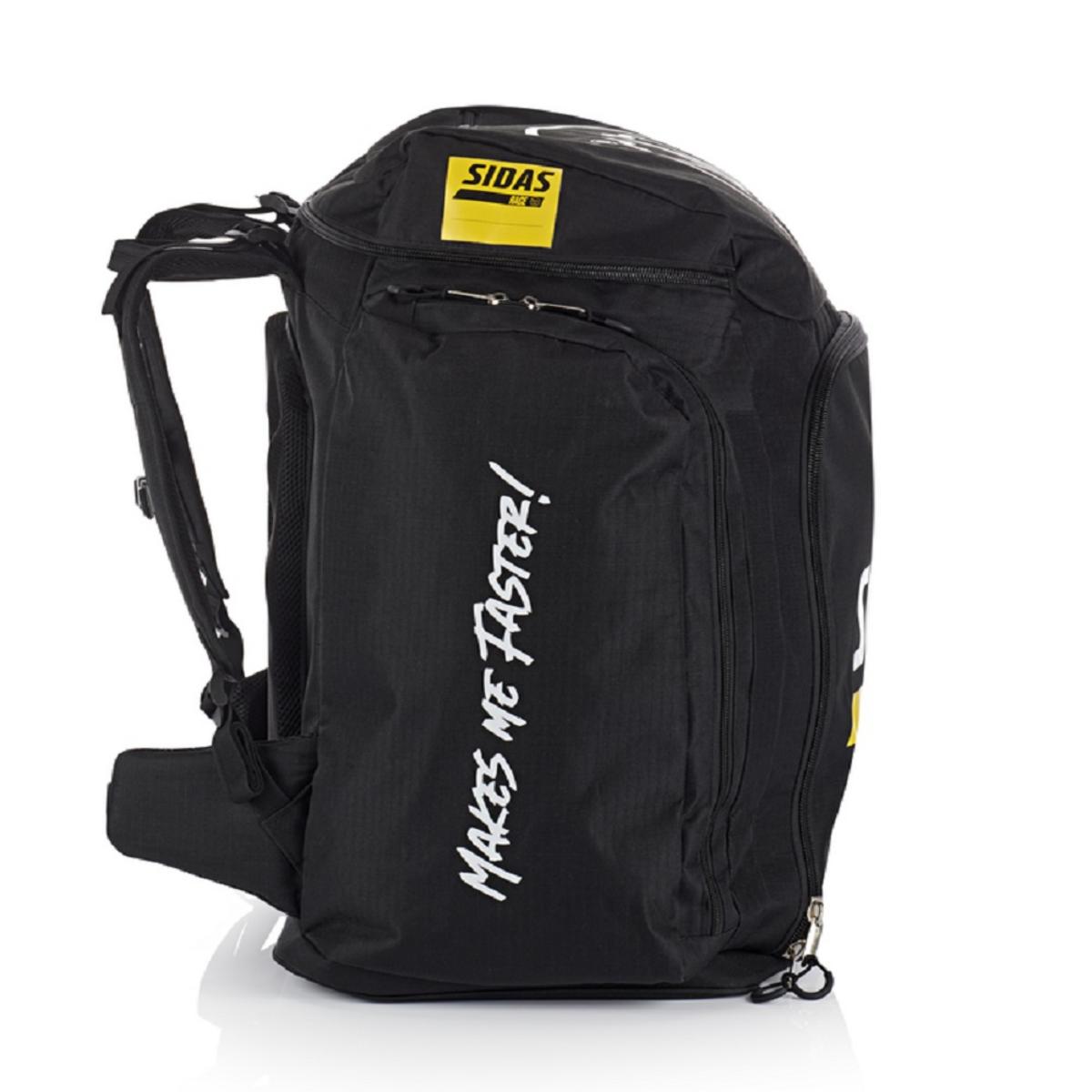A 90-litre storage bag for skiing accessories (boots, helmet, gloves, goggles), ideal for ski racers and young ski club members. Designed by racers for racers, the interior and storage sections have been carefully designed for easy use and access to all your gear, from helmet to boot liners and including your boot shells, plus life’s essentials such as your keys, wallet and phone. And because ski training also involves waiting around, the bag features an integrated folding seat for when you need to sit down or change without getting wet feet. Made of ripstop polyester and 900D polyester, it is extremely tear-resistant and features waterproof panels, useful when you bag is in the hold of a coach and during training sessions, when the bag might be left out in the snow. Black with the racing colours used by Sidas's top racers on their boots, this bag also features an external label for easy identification.